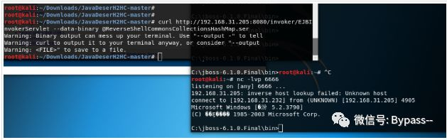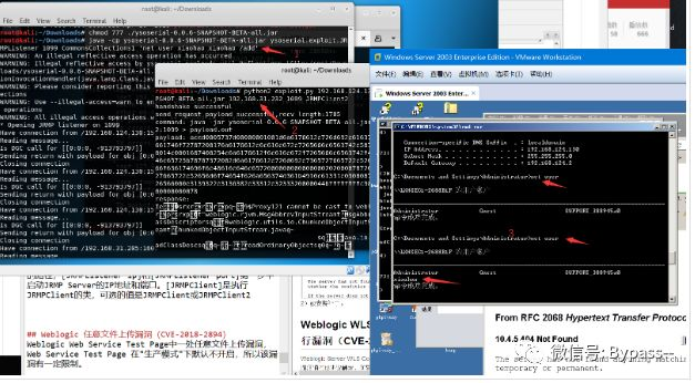 其中,[victim ip]和[victim port]是目标weblogic的IP和端口,[path to ysoserial]是本地(Kail系统上的)ysoserial的路径,[JRMPListener ip]和[JRMPListener port]第一步中启动JRMP Server的IP地址和端口。[JRMPClient]是执行JRMPClient的类,可选的值是JRMPClient或JRMPClient2