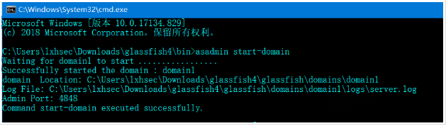 解压后,进入glassfish/bin目录下打开CMD窗口输入asadmin start-domain启动glassfish