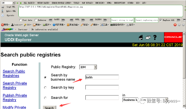 访问 /uddiexplorer/SearchPublicRegistries.jsp,若能正常访问,则可能存在此漏洞,填写任意信息,如下