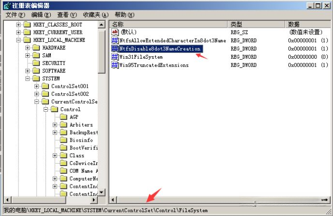 HKEY_LOCAL_MACHINE\SYSTEM\CurrentControlSet\Control\FileSystem,将其中的 NtfsDisable8dot3NameCreation这一项的值设为 1,1代表不创建短文件名格式