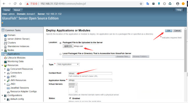 选中war包后上传,填写Context Root 这个关系到你访问的url,点击Ok。
