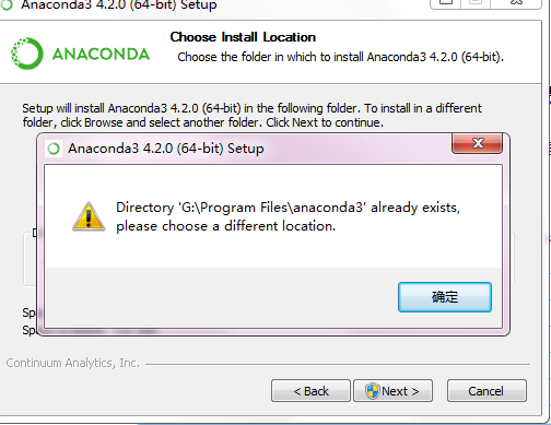 Ps: 在选择路径的过程中,在创建一个anaconda3文件夹之前遇到了问题。尝试访问该文件并点击下一步时会报错提示:directory…has already exist.