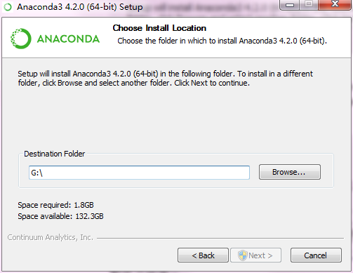 在G盘根目录下手动输入要安装的具体路径设置(该路径尚未被创建,在Anaconda的安装过程中会自行处理其创建问题)