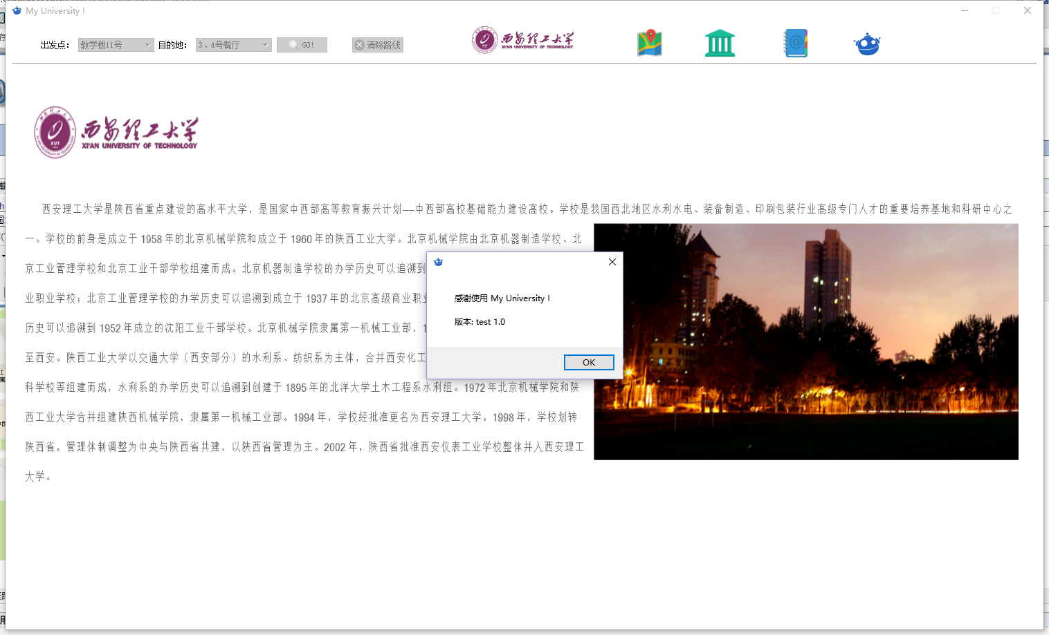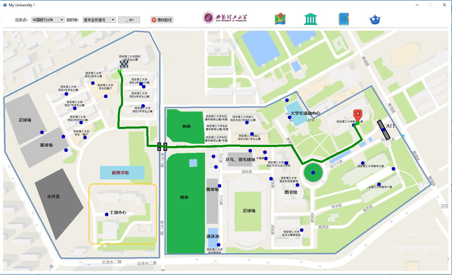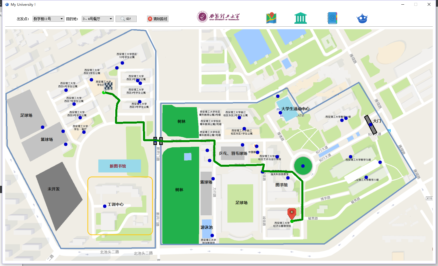 利用课余时间创建了一个小型作品, 该项目聚焦于校园地图系统, 其主要目标在于练习Qt编程语言以及掌握一些基础的数据结构与算法. 该系统的首要功能即是从下拉菜单中选择起始地点与目的地, 随后在地图界面中即可直观地展示出路径规划结果. 主要的技术实现手段包括: 通过图像贴图技术实现路径展示, 并基于动态规划算法计算最优路线