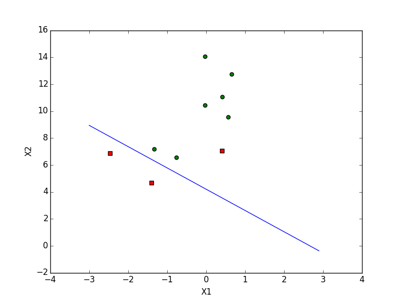 这组红色标记的点原本应属于y=1的数据集中的样本之一,并且其中一个被错误分类。这相当于将所有数据以(x₁, x₂)二维坐标的形式展示出来,并根据回归参数绘制出的一条直线将这些点一分为二。如果有一个新的样本需要判断类别,则只需将其绘制在图上,并查看其位于这条直线哪一侧即可完成分类。
