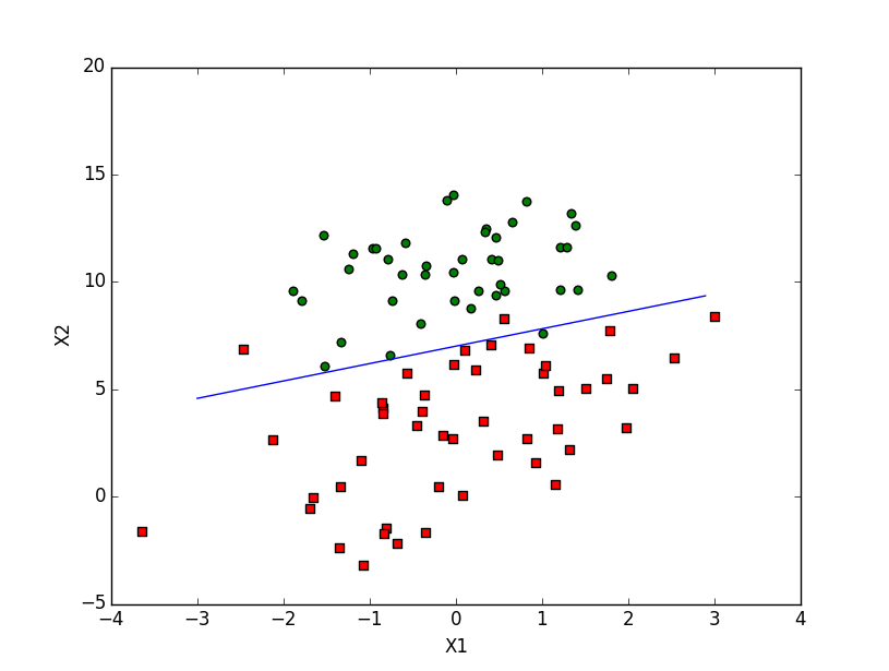 我们之前已经计算出一组回归系数,并确定了各类别数据之间的分隔线。通过分析X内部的数据联系(即x1与x2之间的关系),我们可以绘制出这个分隔线,并能直观地感受到分类的效果。