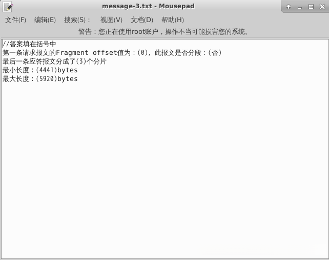 请依次点击桌面左下角的文件夹图标"workspace"并打开实训文件夹"myshixun";随后进入桌面上另一个名为message-3.txt的文件目录进行编辑操作;具体操作如下:启动Wireshark程序并加载实训文件夹中的ip-ethereal-trace-1日志文件;通过观察该日志中各项数据字段的内容来完成后续分析任务;请详细记录以下关键数据点:第一段ICMP请求包中的Fragment offset字段值是多少?以及最后一段ICMP响应包被分割成多少个分片?根据上述测试结果,请计算当主机发送的数据被分割成四个分片时所对应的最小和最大Round Trip Time(RTT)值,并将相关参数记录于指定位置;最后完成上述所有操作后利用git协议将修改后的message-3.txt提交至远程服务器进行版本管理;
