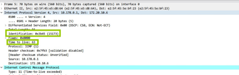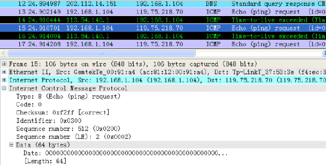 当第一个路由返回超时时会触发该路由返回给我们的IP报信息(考虑到IP报才具备生存时间)我们能够观察到存活时间为63秒其中ID字段值为15173: