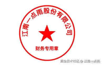 public class SealSample { public static void main(String[] args) throws Exception { Seal seal = new Seal(); seal.setSize(200); SealCircle sealCircle = new SealCircle(); sealCircle.setLine(4); sealCircle.setWidth(95); sealCircle.setHeight(95); seal.setBorderCircle(sealCircle); SealFont mainFont = new SealFont(); mainFont.setText("江南一点雨股份有限公司"); mainFont.setSize(22); mainFont.setFamily("隶书"); mainFont.setSpace(22.0); mainFont.setMargin(4); seal.setMainFont(mainFont); SealFont centerFont = new SealFont(); centerFont.setText("★"); centerFont.setSize(60); seal.setCenterFont(centerFont); SealFont titleFont = new SealFont(); titleFont.setText("财务专用章"); titleFont.setSize(16); titleFont.setSpace(8.0); titleFont.setMargin(54); seal.setTitleFont(titleFont); seal.draw("公章1.png"); } }