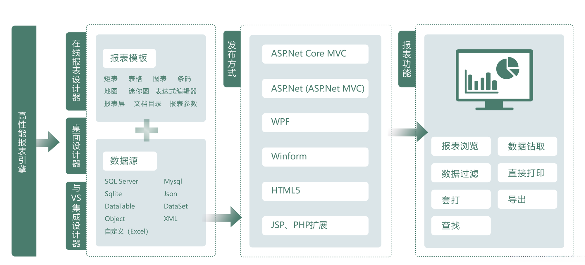 系统集成方案: 该解决方案支持多种开发平台和架构的无缝整合, 包括但不限于web端、移动端及C/S架构, 并且能够将功能完善的报表设计器无缝整合至系统架构, 有效规避后期因技术升级导致的维护困境