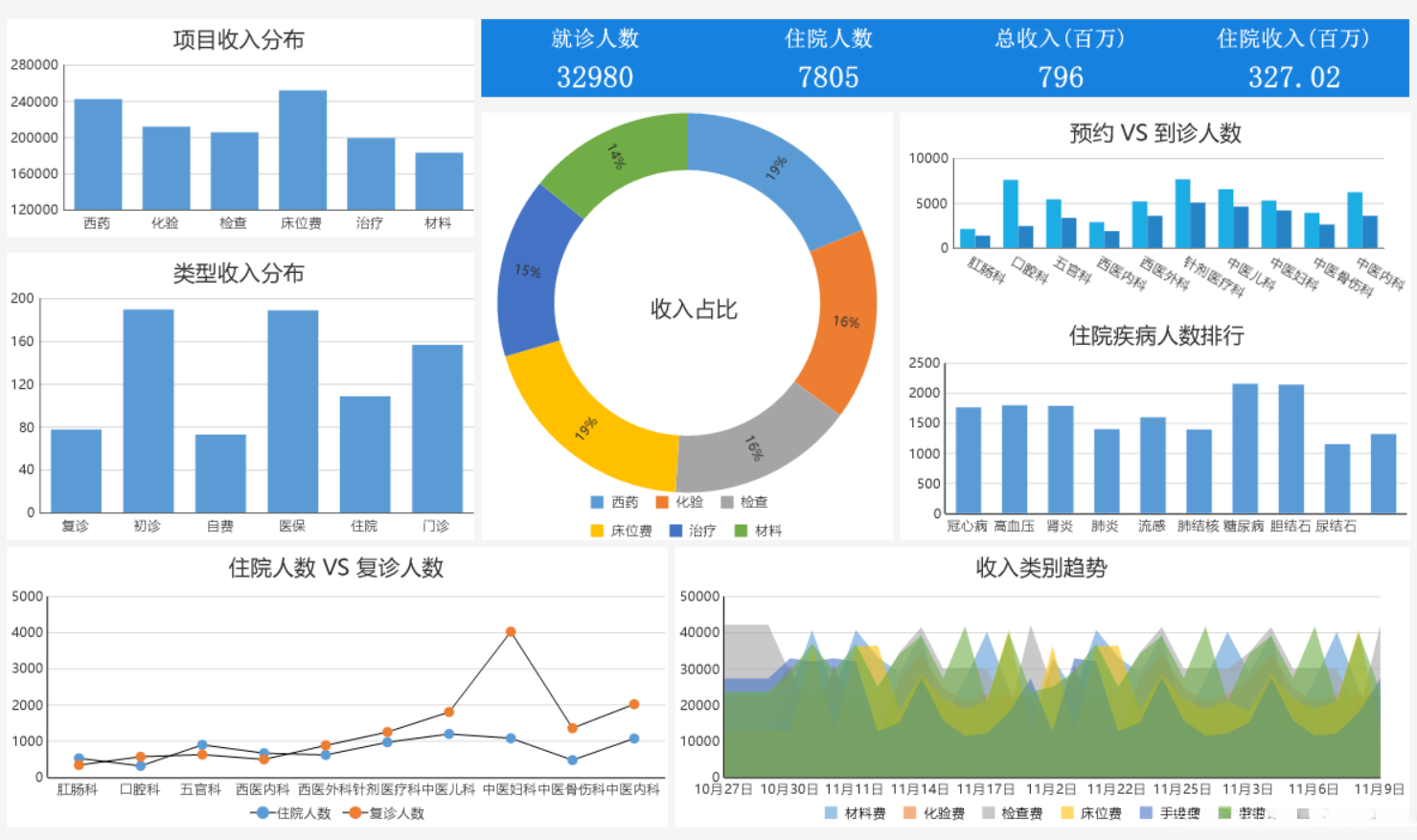 医院因设有众多系统而导致多种报表样式并涉及大量报表内容。尽管如此但其展示格式较为单一缺乏灵活性且数据交互效果欠佳。