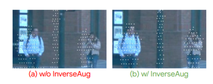 如图(a)所示,在未启用InverseAug的情况下,在相机视图中无法良好地对齐激光雷达上的白色点(即行人与柱子)。相比之下,在图(b)中实现了更好的对齐效果。值得注意的是,在这个对比实验中仅增加了少量数据增强项以提升模型性能。此外,在训练过程中若禁用InverseAug技术,则会导致定位误差更加显著