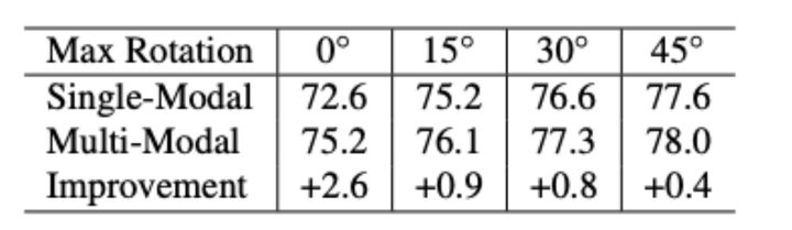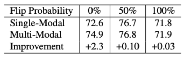 多模态融合带来的性能提升随着随机翻转幅度增大时逐渐减小,并且这也凸显了精确对齐的重要性