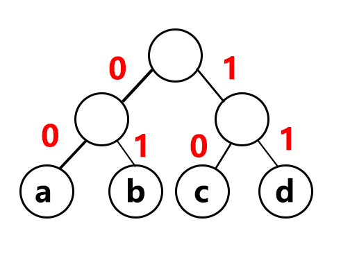 按照这样的编码方式,所有编码字符都在二叉树的叶子结点上,那么对应编码出来的a=00,b=01,c=10,d=11。