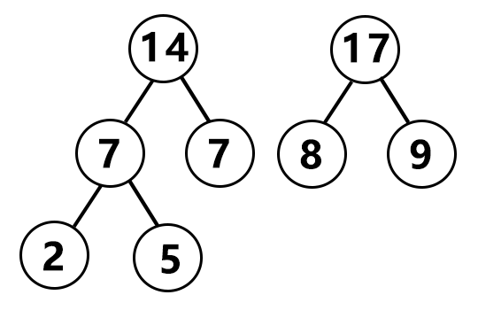 接着再从这个序列中(包括创建好的二叉树的根结点,这里是7 7 8 9)找两个权值最小(7,7)的构建二叉树。