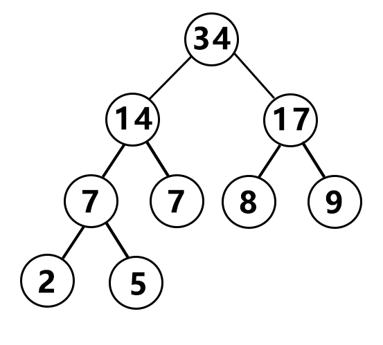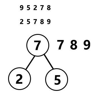 例如我们举个例子:对于下面一个序列,权值排序前是9 5 2 7 8。排序后是2 5 7 8 9。然后按照哈夫曼的方法,首先在这个排好序的序列中找出两个权值最小的组成一个二叉树,根结点为两个权值之和: