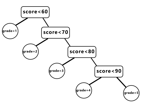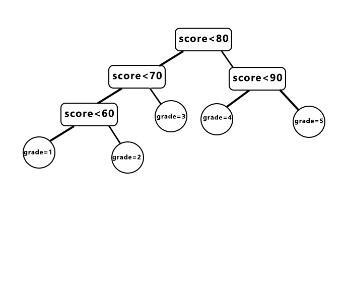 如果成绩低于60分grade就为1,60到69分之间grade=2,70到79之间grade=3,80到89之间grade=4,90分以上grade=5;按照这样的评价标准,每次读入一个学生的成绩后,就对这个成绩进行判断。这样的转换规则,可以用一棵判定树来表示: