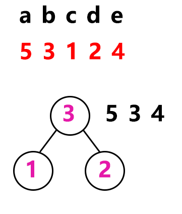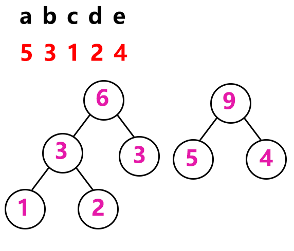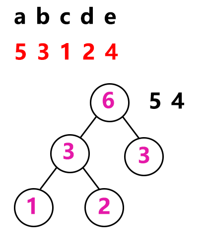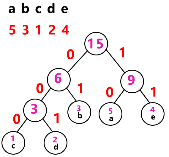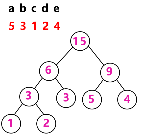 假设a、b、c、d、e五个字符的出现频率分别为a=5、b=3、c=1,d=2、e=4。频率就是看作字符的权值。