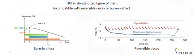 这表明,在实际应用中如果将T80作为标准化的品质因数用于钙钛矿材料稳定性评估时,则会发现这一结果在图5中可见。这一结果不仅难以使其与钙钛矿材料典型的表现特性相协调,并且具体表现在如燃烧效应所示的情况中:其性能先上升后下降(见左图)。此外,在黑暗环境中经过一段时间后能够恢复活性的现象则属于不可逆退化过程(右图)。