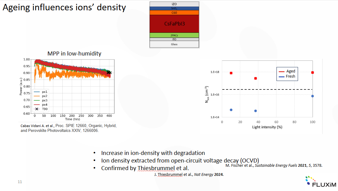 我们致力于开发一种基于铯的FAPbI器件,并以双面应用需求为导向进行设计。在低湿度环境下进行实验测试后,在持续400小时中成功保持了设备90%初始性能水平[6]。为了进一步探究其性能变化规律我们将该设备与先进的表征技术相结合以便深入分析移动离子的行为如其密度或迁移率等特征是否受到材料老化的影响