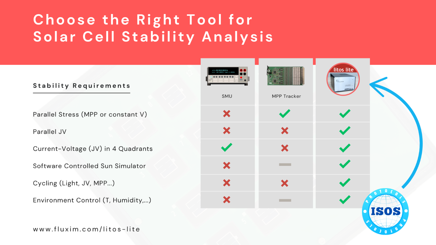 钙钛矿太阳能电池的稳定性稳步提升。钙钛矿数据库中的数据持续增加这一现象得到了证实。为了进一步突破这一发展的界限,仅依赖 MPP 跟踪显然是不够的。为此,我们需要专注于精确执行尽可能多的 ISOS 测试。ISOS 协议则为解决和理解稳定性问题提供了一个系统化的框架结构。为了确保这些测试的有效性,我们必须使用正确的设备进行试点测试,以保证实验条件的安全性和一致性。Litos Lite 实验平台正是满足这些需求的理想选择