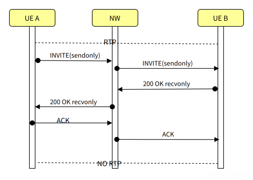 发起呼叫的一方将发送 INVITE 消息,并将媒体流从 sendrecv 转换为 sendonly。当对方返回 200 OK 响应时,则将媒体流进一步转换为 recv-only。双方确认(ACK)后将进入呼叫保持状态,在此状态下无通话相关 RTP 数据包传输。