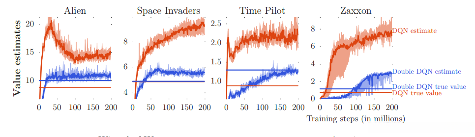 (2)基于实验结果来看,DQN 确实存在高估的问题。如图1所示,在四个不同的游戏场景中(仅排除Double DQN的情况),其他的游戏同样会表现出高估现象,并且这种情况表现得较为常见。