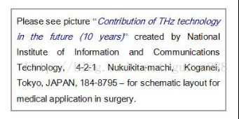 脚注: 目前有几种太赫兹成像产品应用于医疗检测和诊断方面,特别是太赫兹脉冲成像(TPI),太赫兹时域光谱(TDS-THz),持续波太赫兹(CW-THz),和其它太赫兹产生/探测手段。 |