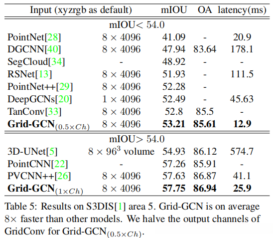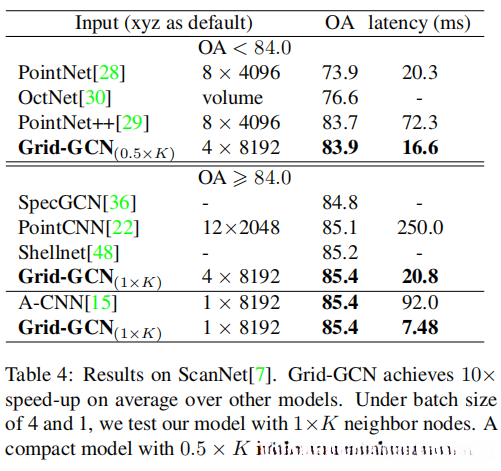 Evaluation 报告了ScanNet的整体体素标记准确性(OA)和时间延迟。训练了Grid-GCN模型的两个版本,一个完整的模型使用1×K节点,而紧凑模型使用0.5×K节点。结果记录在表4中。