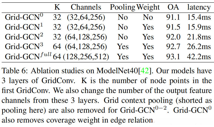 - 一方面,减少来自Grid-GCN full的通道数量可以使Grid-GCN3的速度提高37%。