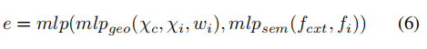 其中,\tilde{f_{c,i}}是来自节点的贡献,x_i是节点的xyz位置。 M是多层感知器(MLP),e是边缘注意函数,而A是聚集函数。 -