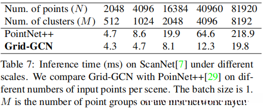 表释: 在2048点的设置下,两个模型的等待时间相似。但是,当将输入点从4096增加到81920时,Grid-GCN可以达到PointNet ++的11倍加速,这显示了我们模型在处理大规模点云中的主导能力。
