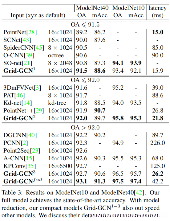 Evaluation 在第一层中,特征通道的数量和组中节点的数量有所不同(请参见表6)。结果如表3所示。对于这四个设置,Grid-GCN模型不仅在ModelNet10和ModelNet40数据集上均达到了最先进的性能,而且具有最佳的速度精度权衡。尽管Grid-GCN使用CAGQ模块进行数据结构化,但它的延迟时间与PointNet相似,后者没有数据结构化步骤,但其准确性明显高于PointNet。
