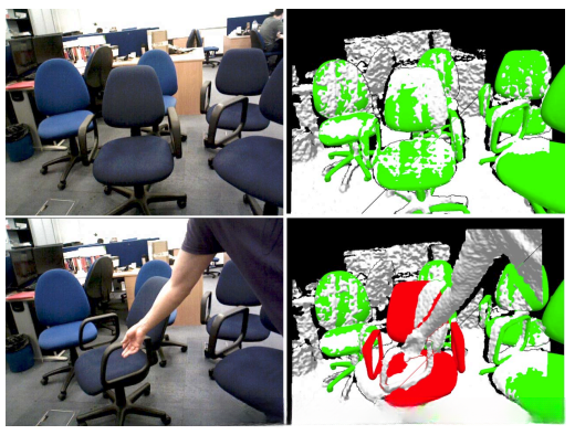 图8. 当建图的物体大部分和好的测量(绿色)不一致的时候,被标记为无效(红色),来自于它的观测将被舍去。