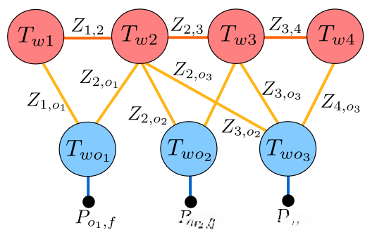 图5. 表示相机、物体姿态的节点,以及节点之间关系:在某个相机姿态下观测到的物体,相机之间运动的约束。底部的P表示物体的先验。