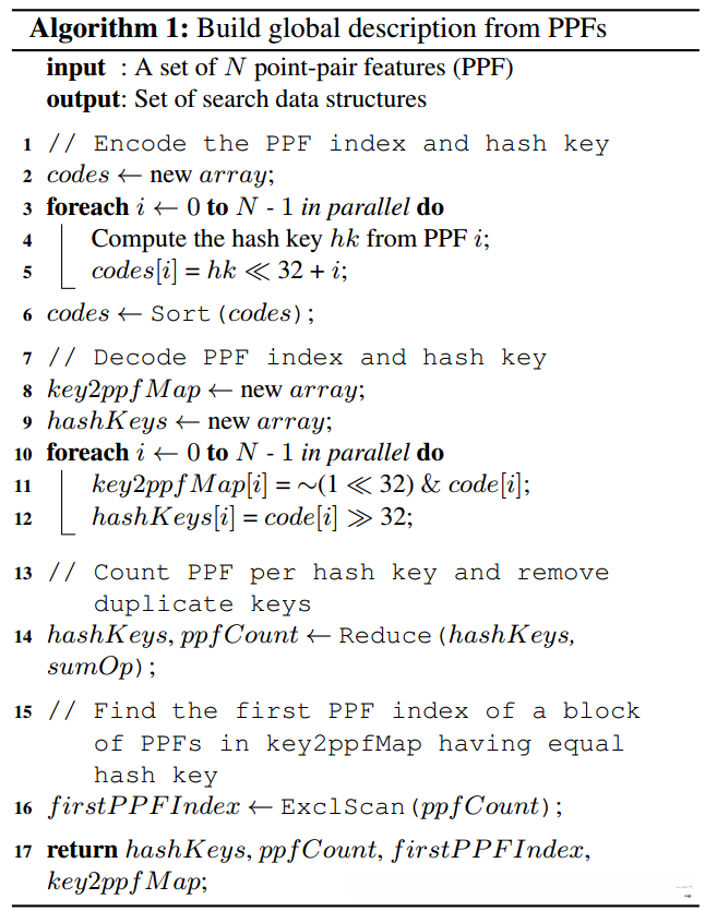 在GPU中快速生成每个物体网格的全局描述子,通过离散相似的PPFs值,并且储存到适合搜索的数据结构中。