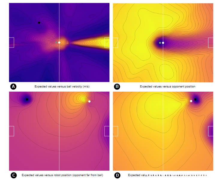 该图显示了作为球的速度矢量的函数的预测值;高值被分配给指向球门的球速度,也被分配给与在agent的控制下保持球在区域内一致的球速度