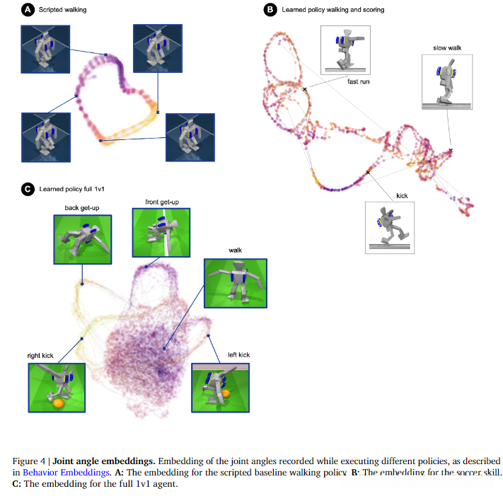 - 结果表明,agent会根据比赛的具体情况调整步态。