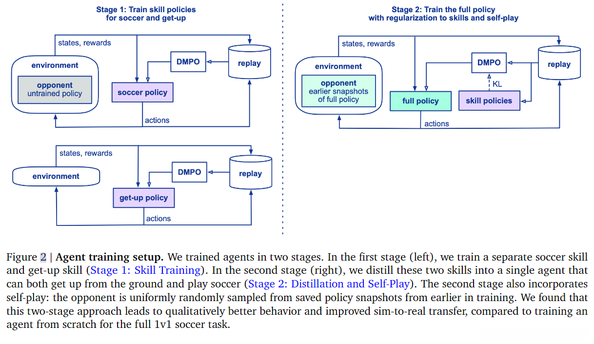 在第一阶段,分别训练进球和起身的技巧策略。在第二阶段,技能被提炼成一个1v1的agent,并且agent通过自我游戏进行训练。