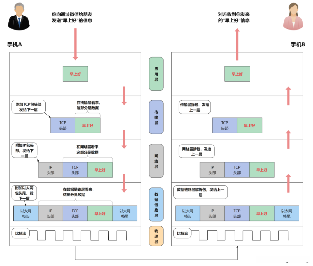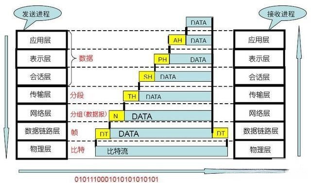 - 物理层**:主要定义物理设备标准,如网线的接口类型、光纤的接口类型、各种传输介质的传输速率等。它的主要作用是传输比特流(就是由1、0转化为电流强弱来进行传输,到达目的地后在转化为1、0)。这一层的数据叫做比特。**