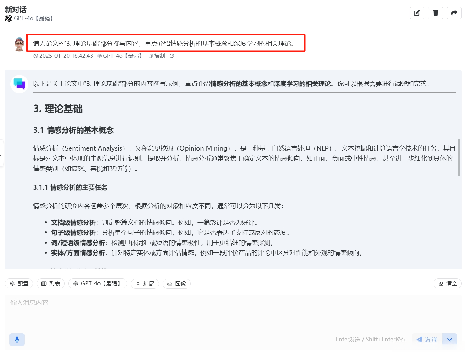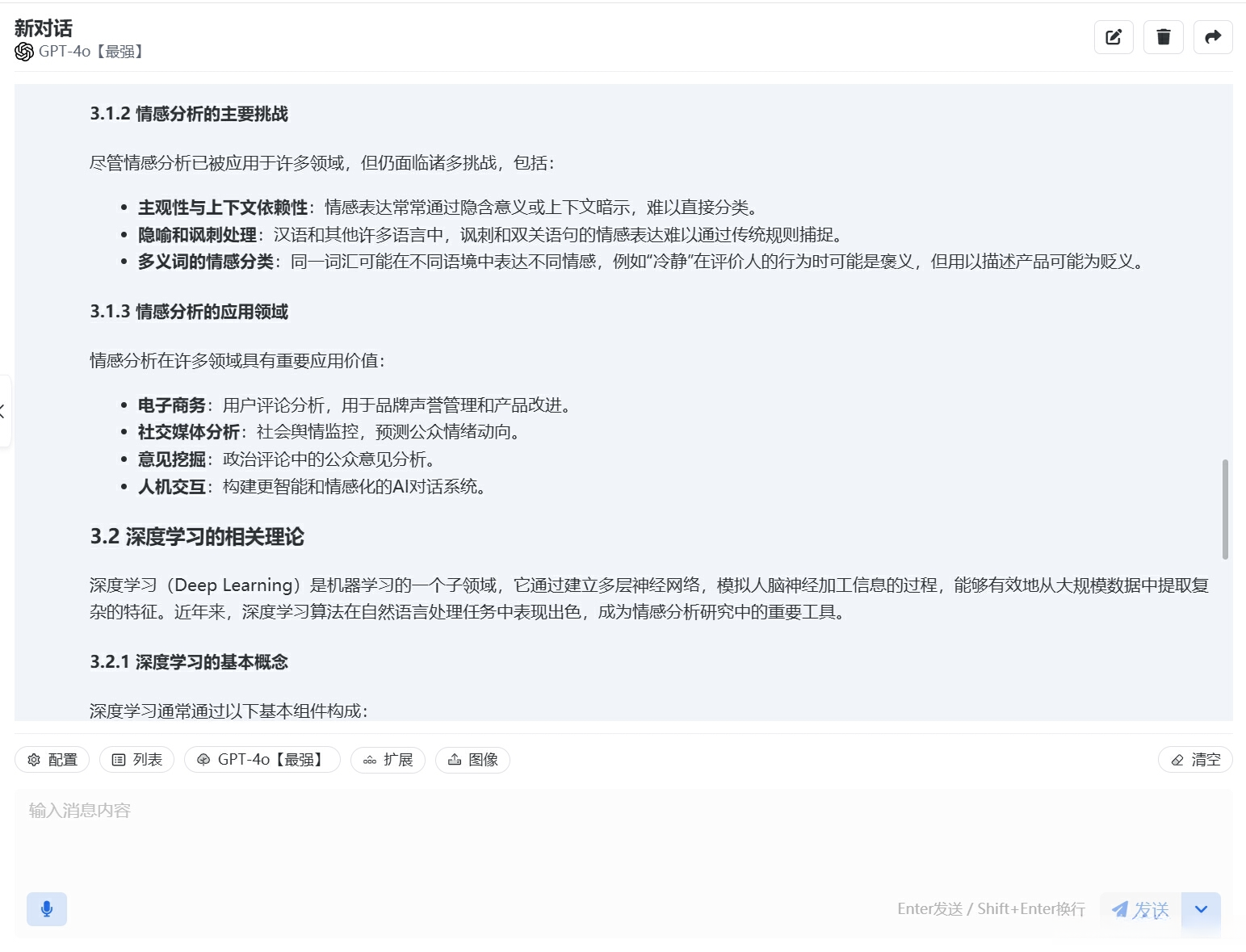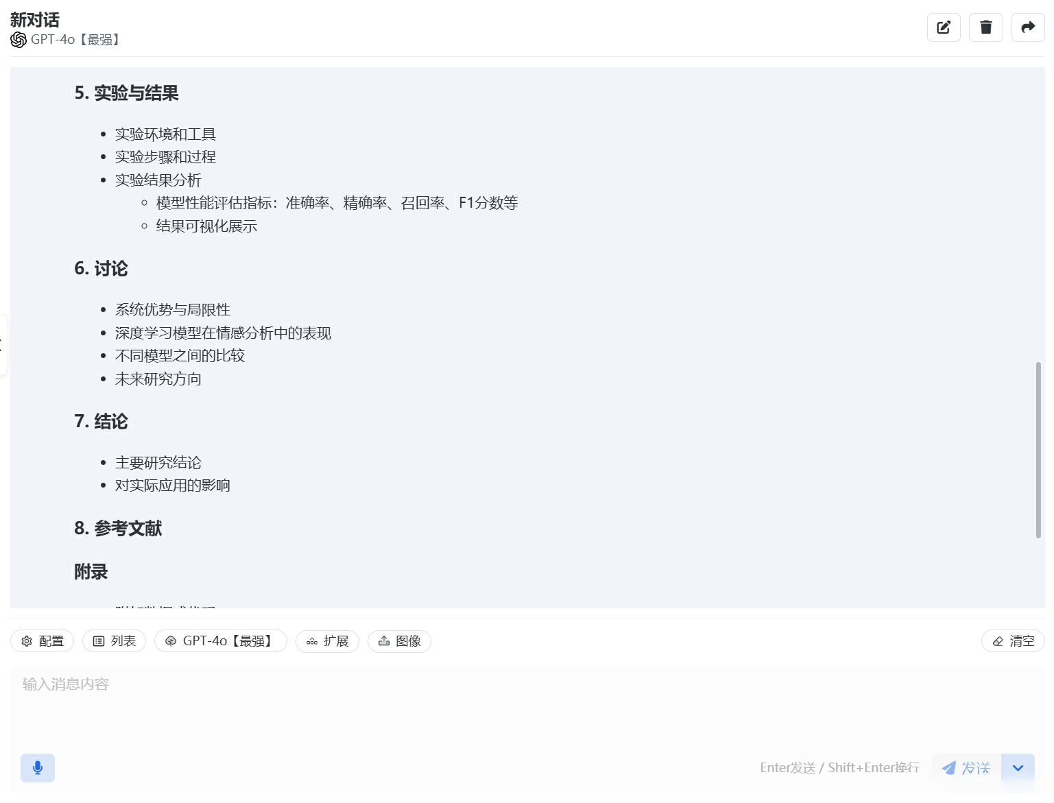 通过本文的实战演示,我们展示了如何利用ChatGPT高效撰写一篇关于“基于深度学习的情感分析系统”的论文。从模型选择到大纲创作,再到正文扩写和改写,ChatGPT为我们的学术写作提供了强有力的支持。在此基础上,我们也分享了一些实用的提问技巧,以帮助读者更好地利用这一工具。希望这些经验能够帮助你在学术写作中事半功倍,轻松完成高质量的论文创作!