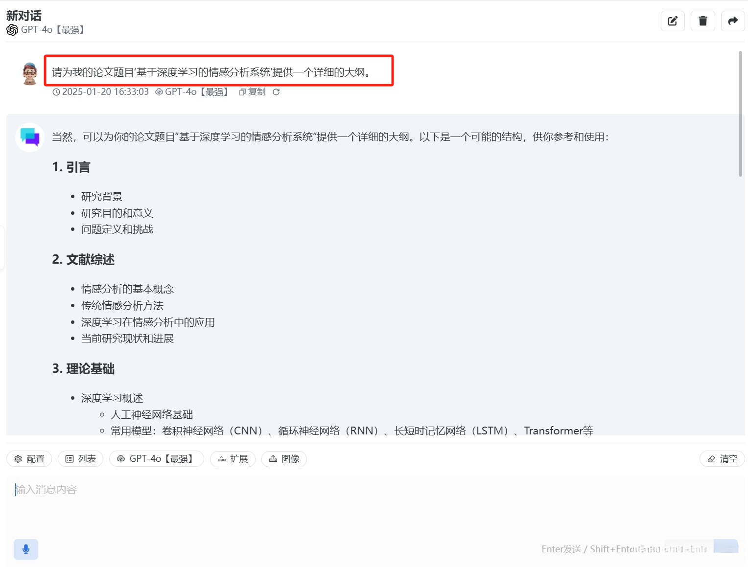 * “请为我的论文题目‘基于深度学习的情感分析系统’提供一个详细的大纲。”