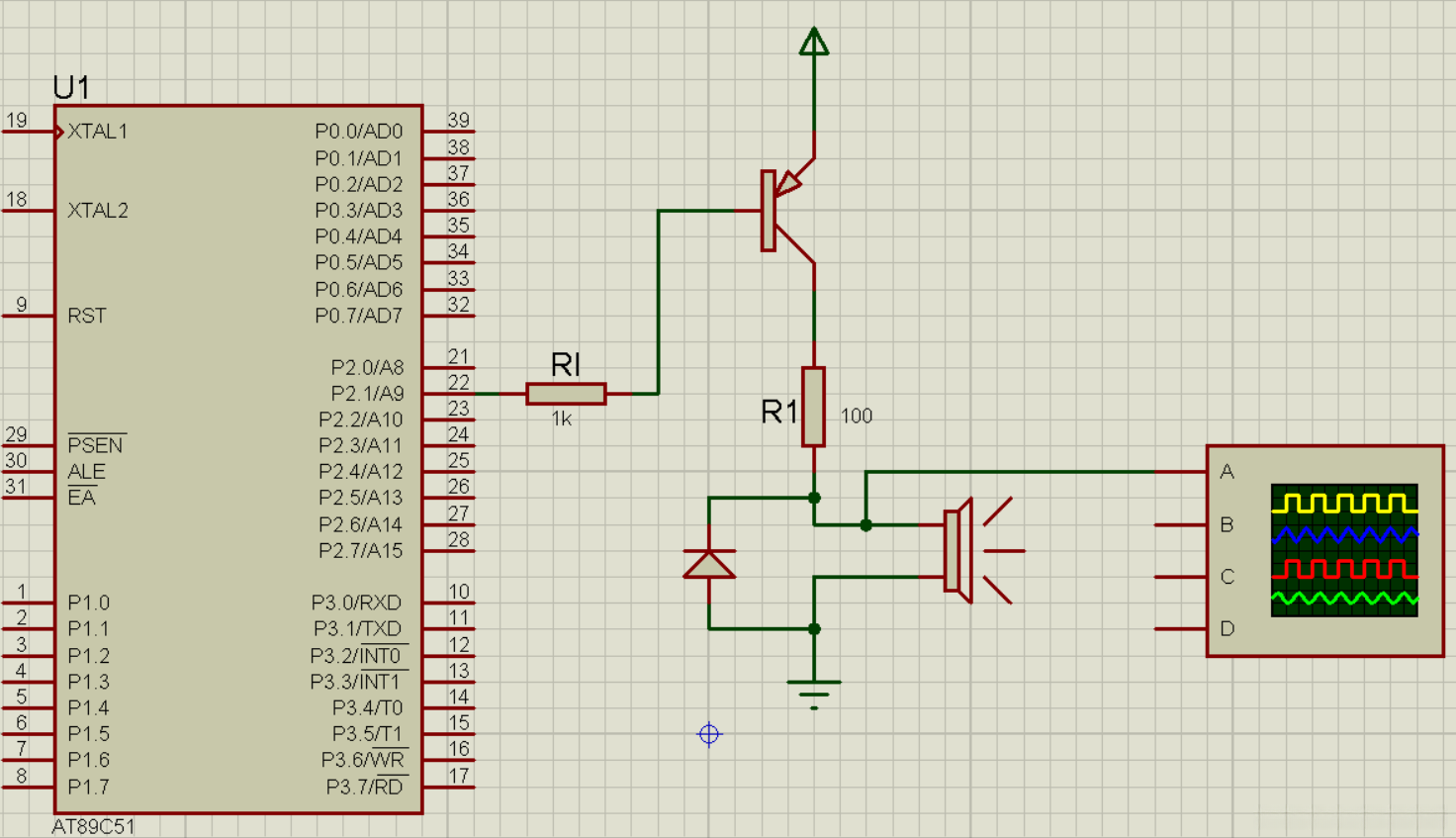 蜂鸣器的运行机制基于接通和断开后,在特定引脚生成磁场并吸引铁片完成动作;当磁场消退后会恢复原状从而发出声音。原理图通过PNP型三极管在放大区发挥开关作用,并采用共发射极放大电路来控制磁场的变化过程。Ri在此电路中起输入电阻的作用,在此电路中输入电阻值越大,则放大电路所获取的有效输入电压越高。R1作为限流电阻,在这种情况下其主要功能是限制电流强度以保护蜂鸣器。另外因为蜂鸣器内部采用了电磁线圈结构,在断开电源时电流并不会立即消失因此为了消耗该残留电流我们会在输出端接上二极管进行处理