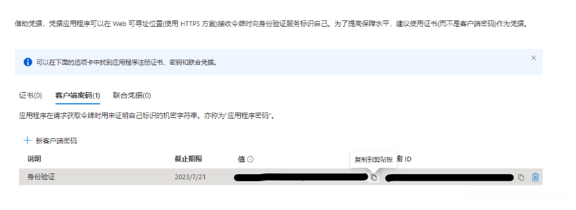 然后进入“证书和密码”去创建新客户端密码后输入说明并选择截止期限后点击“添加”。