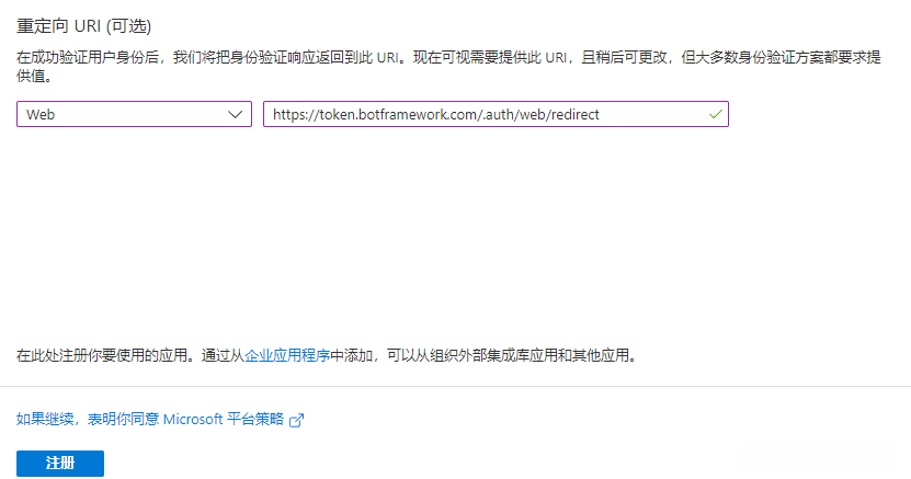 粘贴到刚才注册应用程序的“重定向URI”的框内后点击“注册”。