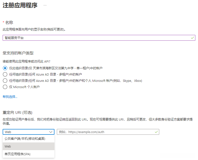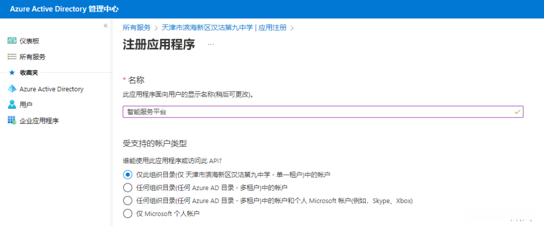 输入新创建的应用程序名称后,在“受支持的账号类型”中选择“仅此组织目录(仅 天津市滨海新区汉沽第九中学 - 单一租户)中的帐户”。