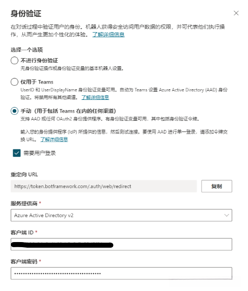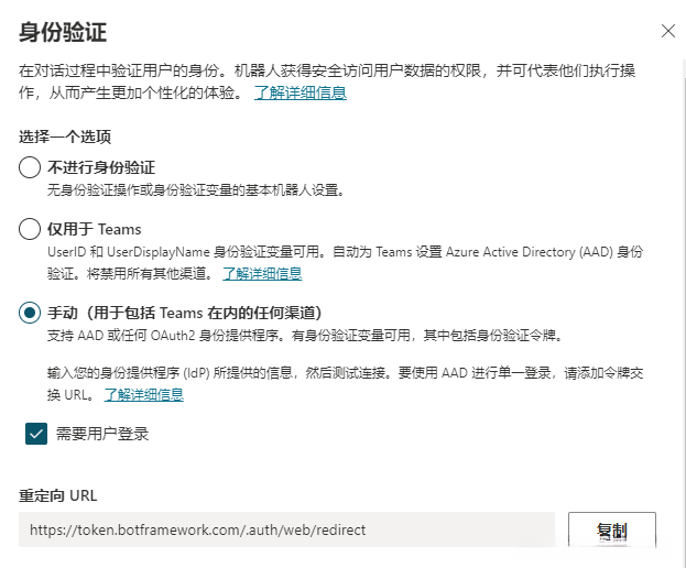 在“身份验证”中选择“手动(用于包括Teams在内的任何渠道)”。复制“重定向URl”的链接。