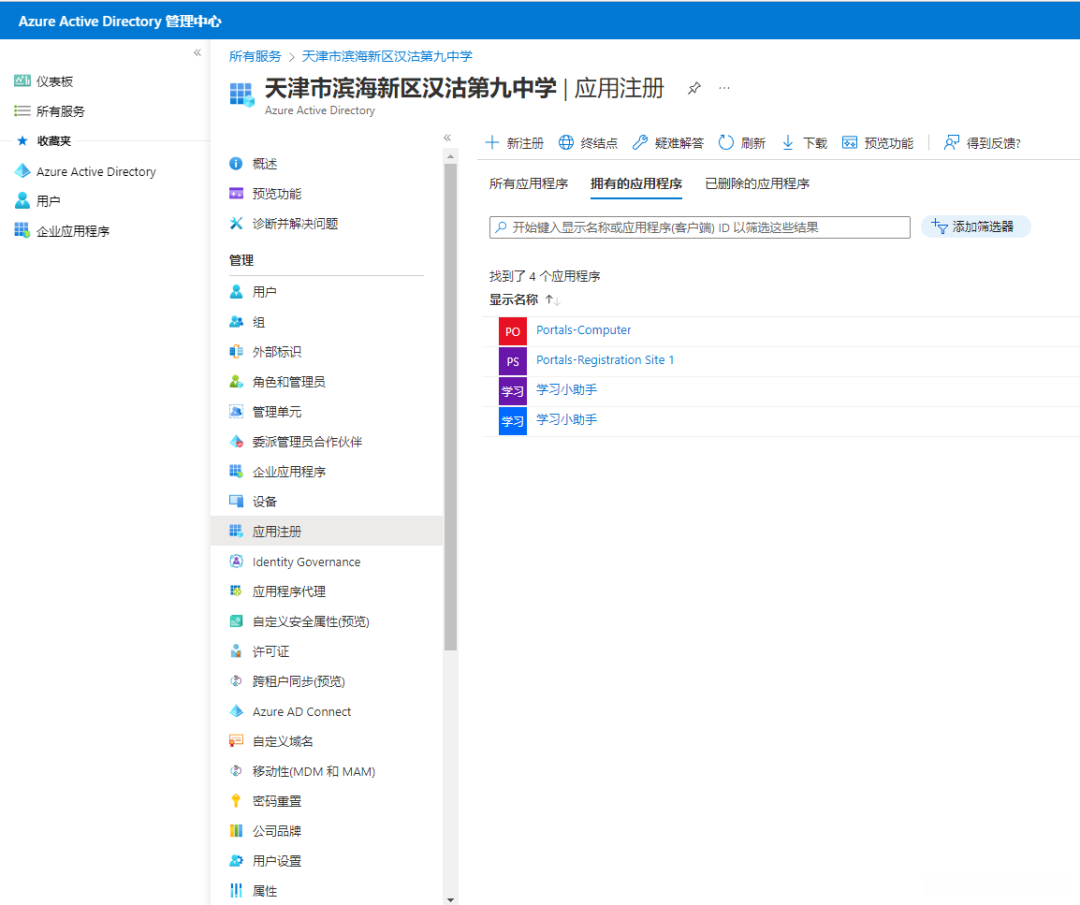 进入“Azure Active Directory管理中心”后选择“Azure Active Directory”中的“应用注册”-“+新注册”。