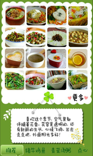 | | 例如: 如果,用户新添加了“吃货”模块气球,则“吃货”主界面会显示南华大学食堂的各各窗口菜单的详细信息(如:今天各各窗口都有什么菜及菜价)。 如果,你还在为今天吃什么而犹豫不决;如果,你还是挤人群中,只为瞧瞧今天有哪下美味佳肴;试试这款APP中的“吃货”模块气球功能吧!实现(此款APP在手,美味佳肴逃不走) 【下图为“吃货”模块功能界面】 (菜单详情) (菜品及其价格)