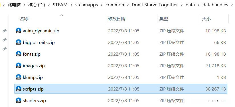 Steam目录下的安装路径\Steam apps commonly used\Don't Starve Together\data文件夹\databundle文件夹\脚本包